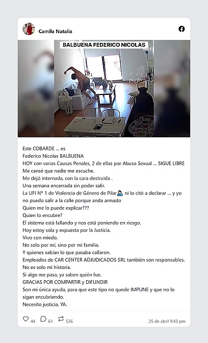 La joven, identificada como Camila, relató que vivió episodios de violencia durante varios meses y que decidió hacer pública su situación ante la falta de respuestas judiciales.