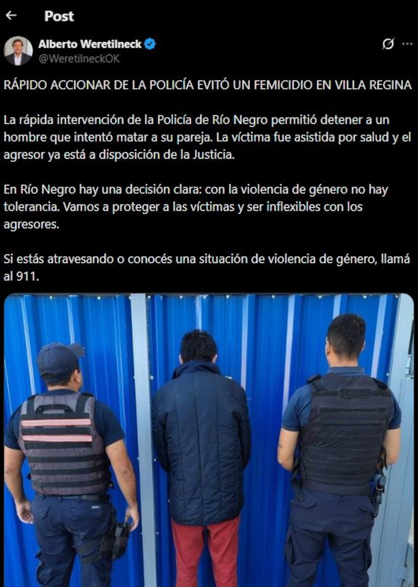 El gobernador de Río Negro, Alberto Weretilneck, se refirió al caso y destacó el accionar policial.