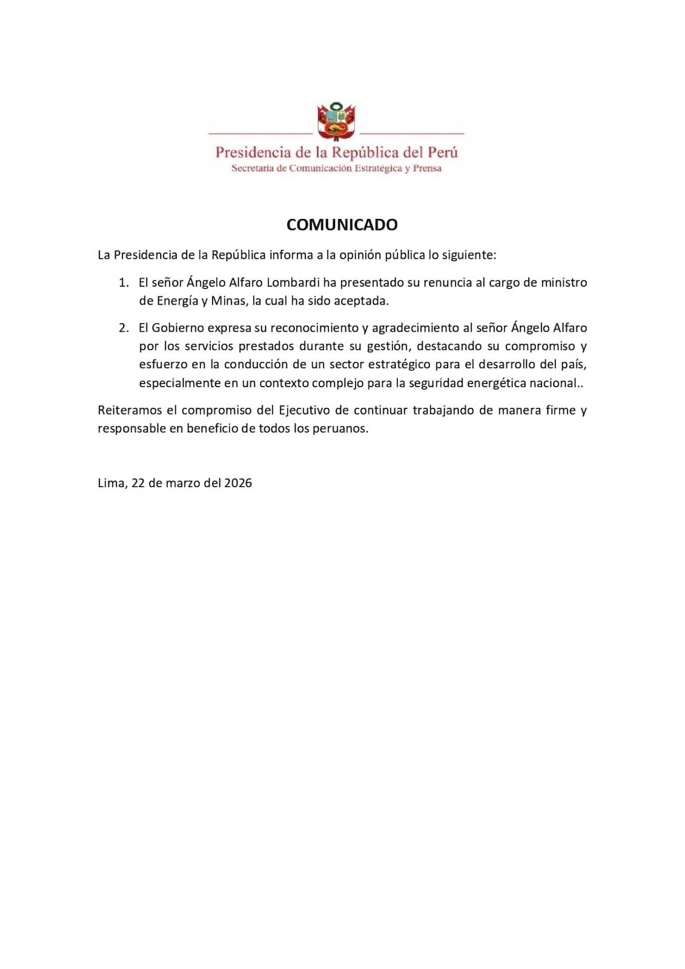 El ministro de Energía y Minas, Ángelo Alfaro, presentó este domingo su carta de renuncia, después de que una mujer denunciara que fue agredida sexualmente por él cuando era una adolescente de 16 años.
