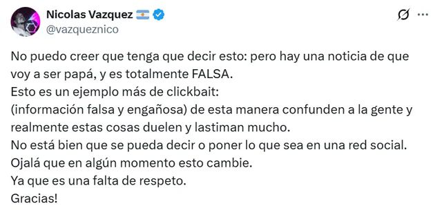 Visiblemente molesto, Vázquez señaló el peligro de difundir información falsa y apuntó al clickbait: "Esto es un ejemplo más de clickbait (información falsa y engañosa). De esta manera confunden a la gente y realmente estas cosas duelen y lastiman mucho".